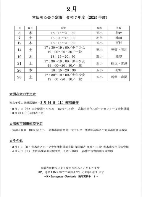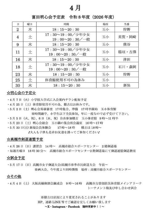 | 3月30日予定 | 富田明心会 卒団式・懇親会 |